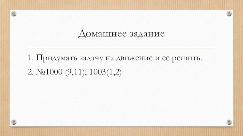 Домашнее задание1. Придумать задачу на движение и ее решить.2. №1000 (9,11), 1003(1,2)