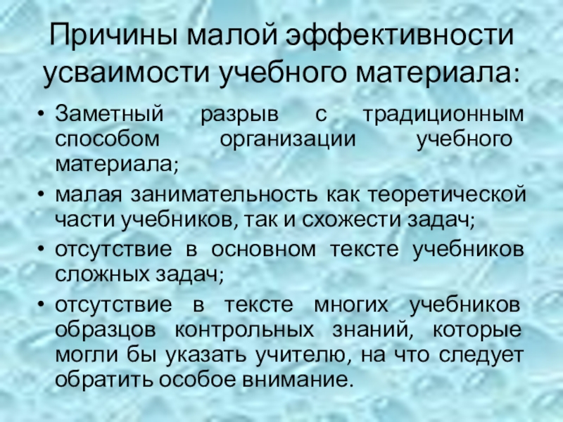 Слайд 5Причины малой эффективности усваимости учебного материала:
