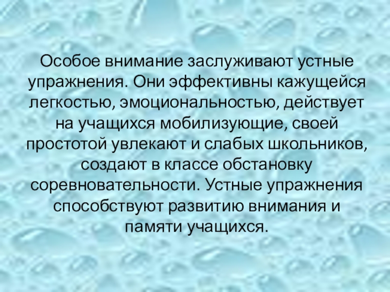 Слайд 13Особое внимание заслуживают устные упражнения. Они эффективны кажущейся легкостью, эмоциональностью, действует