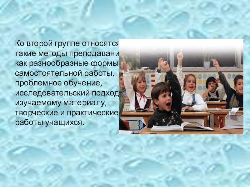 Слайд 8Ко второй группе относятся такие методы преподавания, как разнообразные формы самостоятельной
