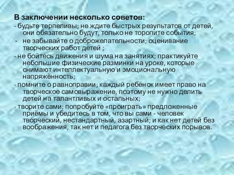 - помните о равноправии; каждый ребёнок имеет право на творческое самовыражение, поэтому не нужно делить детей на талантливых и остальных;