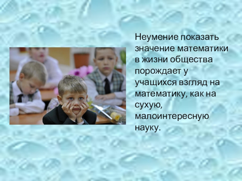 Слайд 3Неумение показать значение математики в жизни общества порождает у учащихся взгляд