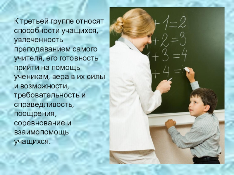 Слайд 9К третьей группе относят способности учащихся, увлеченность преподаванием самого учителя, его