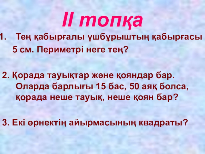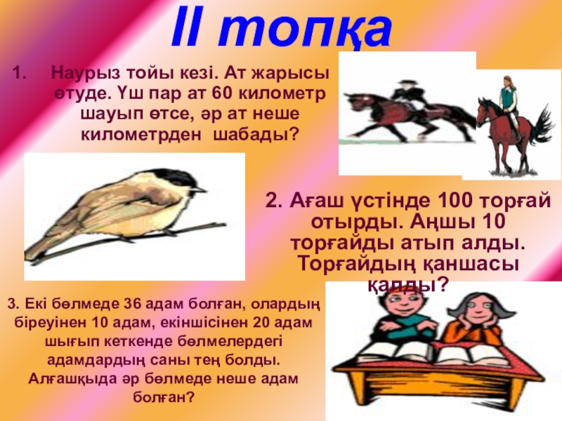 2. Ағаш үстінде 100 торғай отырды. Аңшы 10 торғайды атып алды. Торғайдың қаншасы қалды?