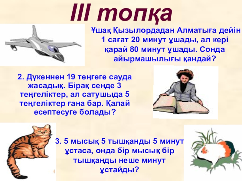 3. 5 мысық 5 тышқанды 5 минут ұстаса, онда бір мысық бір тышқанды неше минут ұстайды?