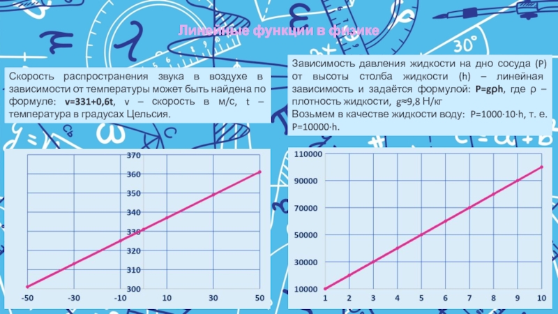 Зависимость давления жидкости на дно сосуда (P) от высоты столба жидкости (h) – линейная зависимость и задаётся формулой: P=gρh, где ρ – плотность жидкости, g≈9,8 Н/кг