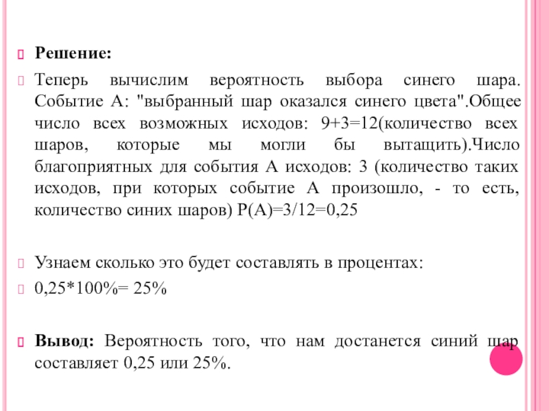 Вывод: Вероятность того, что нам достанется синий шар составляет 0,25 или 25%.