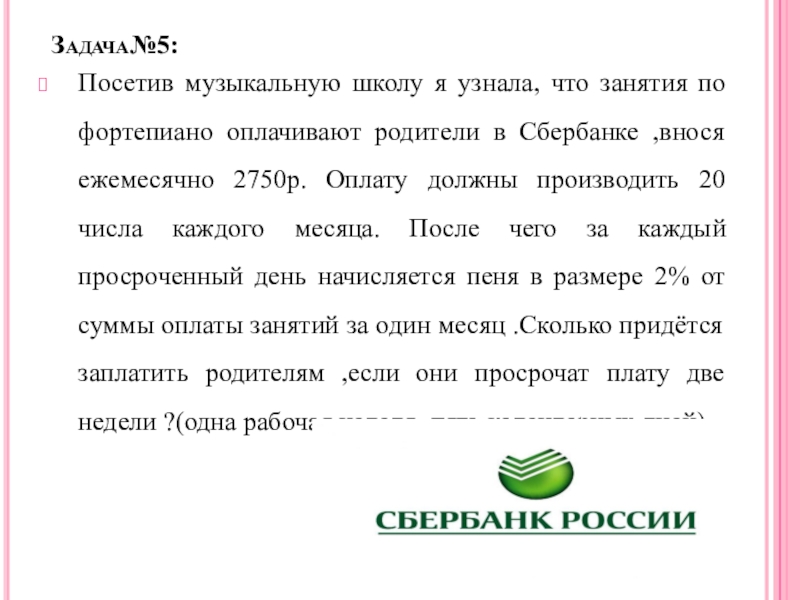 в Сбербанке ,внося ежемесячно 2750р. Оплату должны производить 20 числа каждого месяца. После чего за каждый просроченный день начисляется пеня в размере 2% от суммы оплаты занятий за один месяц .Сколько придётся заплатить родителям ,если они просрочат плату две недели ?(одна рабочая неделя- пять календарных дней)