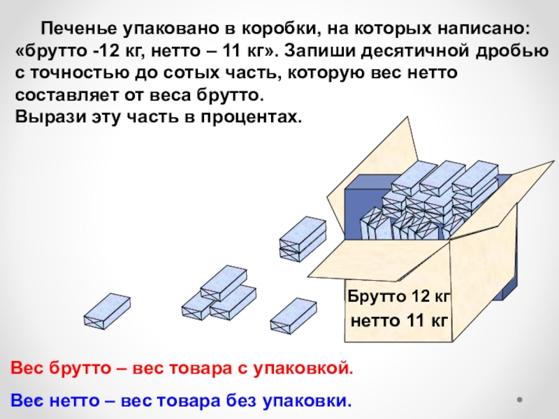 Печенье упаковано в коробки, на которых написано: «брутто -12 кг, нетто – 11 кг». Запиши десятичной дробью с точностью до сотых часть, которую вес нетто составляет от веса брутто.