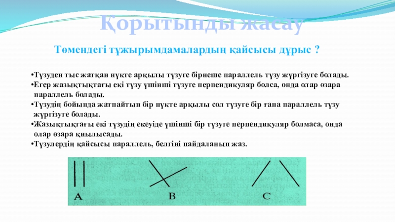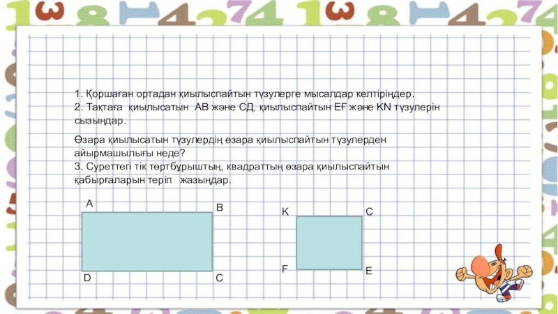 Өзара қиылысатын түзулердің өзара қиылыспайтын түзулерден айырмашылығы неде? 3. Суреттегі тік төртбұрыштың, квадраттың өзара қиылыспайтын қабырғаларын теріп жазыңдар.