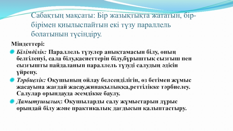Білімділік: Параллель түзулер анықтамасын білу, оның белгіленуі, сала білу,қасиеттерін білу,бұрыштық сызғыш пен сызғышты пайдаланып параллель түзуді салудың әдісін үйрену.