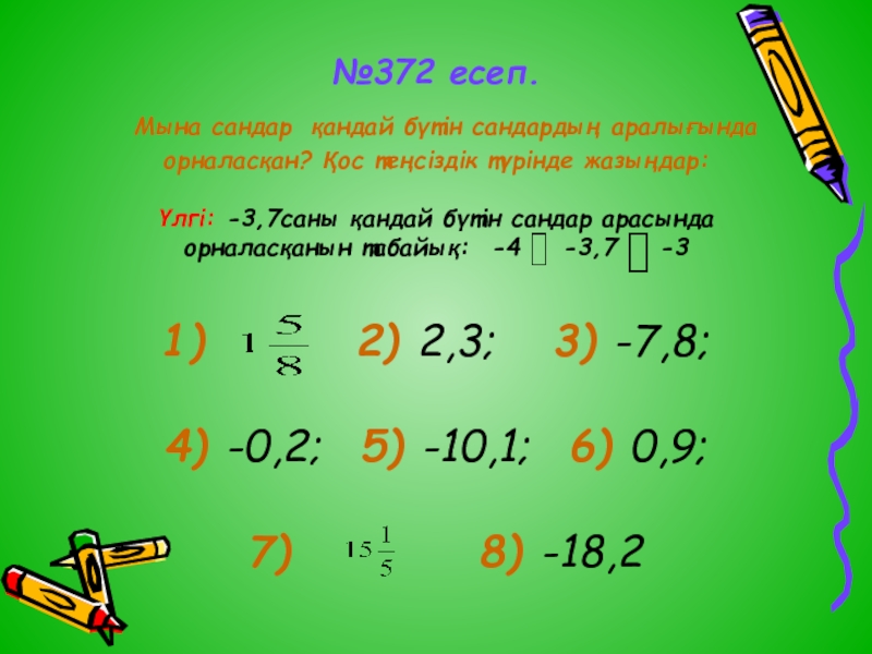 Үлгі: -3,7саны қандай бүтін сандар арасында орналасқанын табайық: -4 -3,7 -3