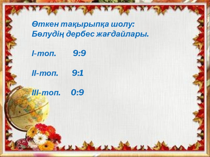 Өткен тақырыпқа шолу:Бөлудің дербес жағдайлары.І-топ.     9:9ІІ-топ.    9:1ІІІ-топ.   0:9