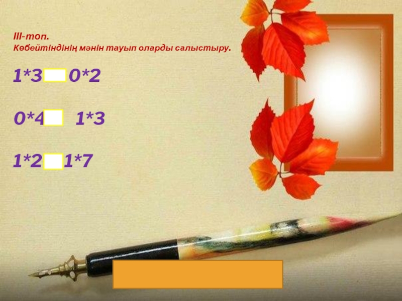 ІІІ-топ. Көбейтіндінің мәнін тауып оларды салыстыру.1*3    0*20*4    1*31*2   1*7