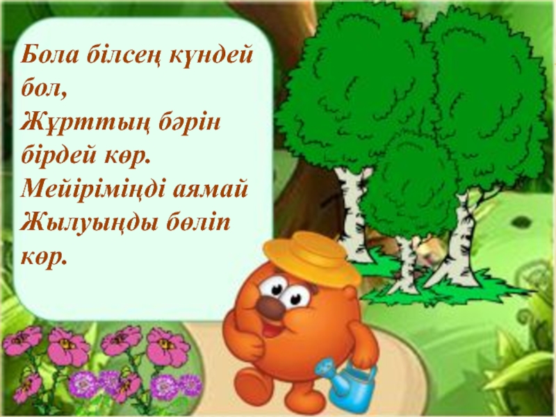 Бола білсең күндей бол,Жұрттың бәрін бірдей көр.Мейіріміңді аямайЖылуыңды бөліп көр.