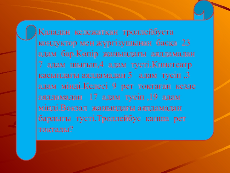 Слайд 13Қаладан кележатқан троллейбуста кондуктор мен жүргізушынан басқа 23 адам бар.Көпір жанындағы