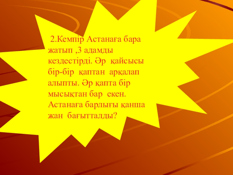 Слайд 15 2.Кемпір Астанаға бара жатып ,3 адамды кездестірді. Әр қайсысы бір-бір