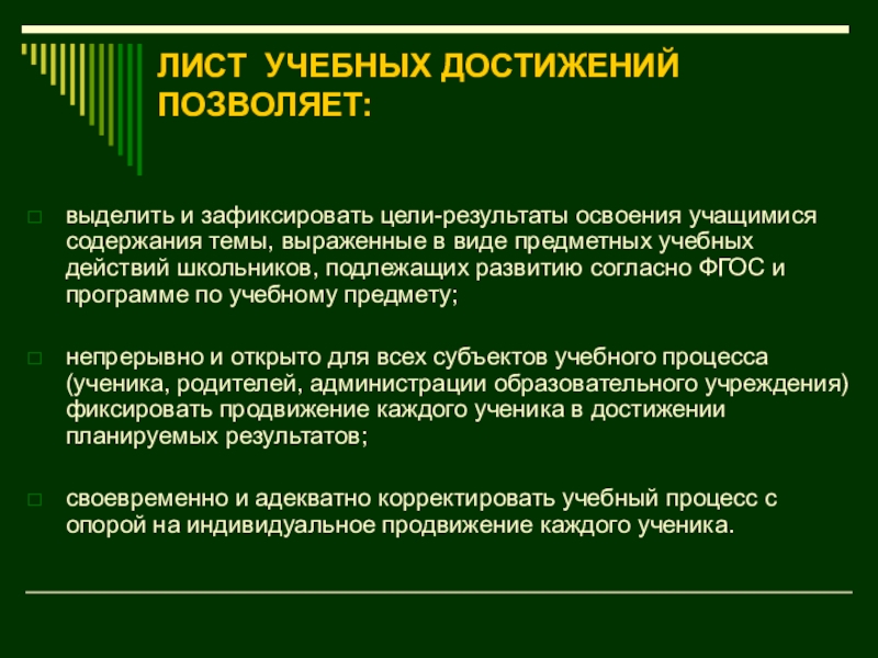 Слайд 27ЛИСТ УЧЕБНЫХ ДОСТИЖЕНИЙ ПОЗВОЛЯЕТ: