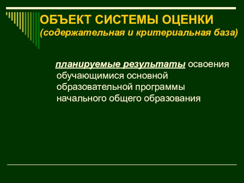 Слайд 5ОБЪЕКТ СИСТЕМЫ ОЦЕНКИ (содержательная и критериальная база)