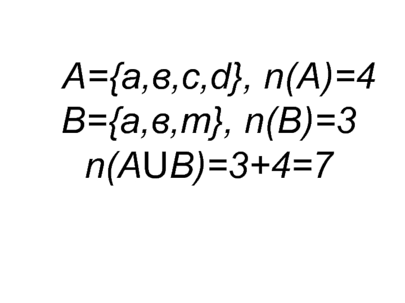 А={а,в,с,d}, n(А)=4 В={а,в,m}, n(В)=3 n(АUВ)=3+4=7