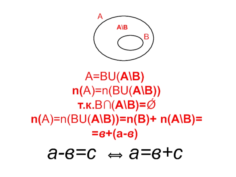 Слайд 14А=ВU(А\В) n(А)=n(ВU(А\В)) т.к.В∩(А\В)=Ǿ n(А)=n(ВU(А\В))=n(В)+ n(А\В)= =в+(а-в) а-в=с а=в+с