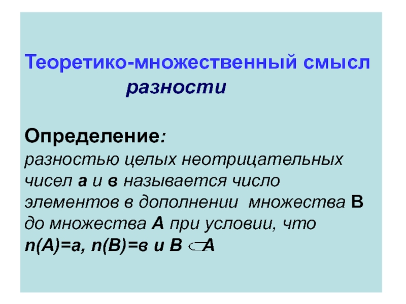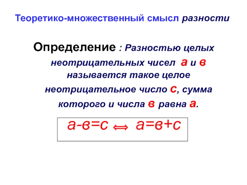 Теоретико-множественный смысл разностиОпределение : Разностью целых неотрицательных чисел а и в называется такое целое неотрицательное число