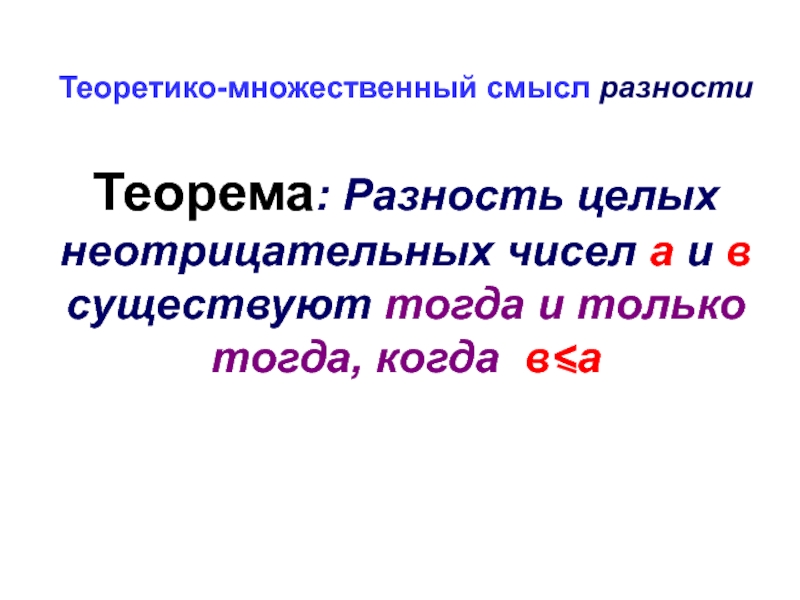Слайд 16Теоретико-множественный смысл разности Теорема: Разность целых неотрицательных чисел а и в существуют