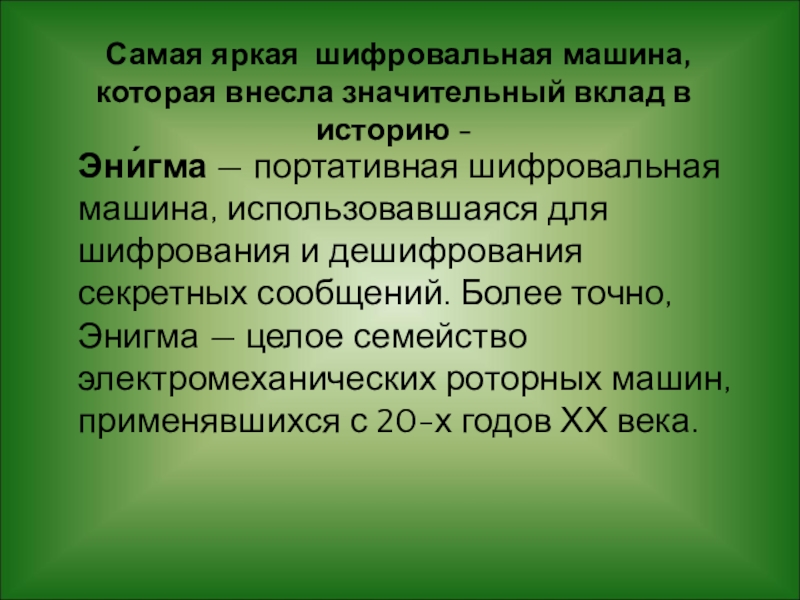 Эни́гма — портативная шифровальная машина, использовавшаяся для шифрования и дешифрования секретных сообщений. Более точно, Энигма — целое семейство электромеханических роторных машин, применявшихся с 20-х годов ХХ века.