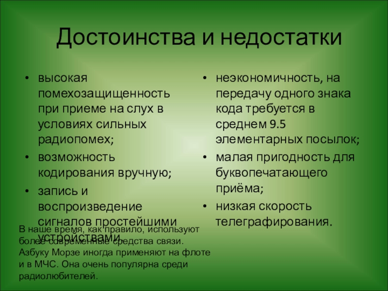 В наше время, как правило, используют более современные средства связи. Азбуку Морзе иногда применяют на флоте и в МЧС. Она очень популярна среди радиолюбителей.