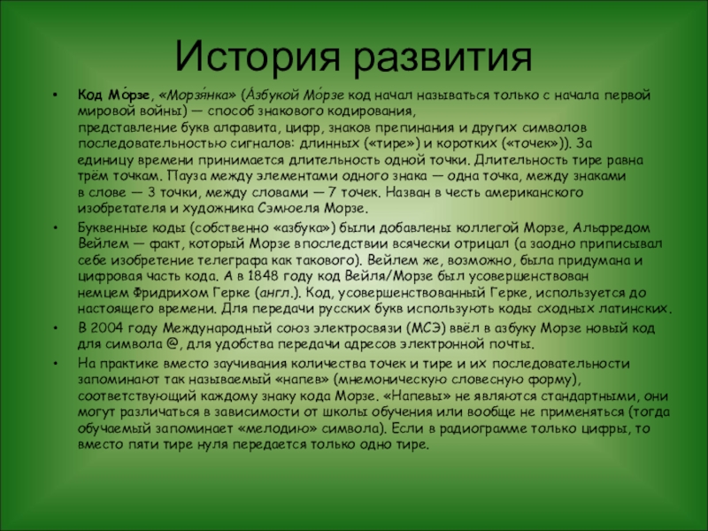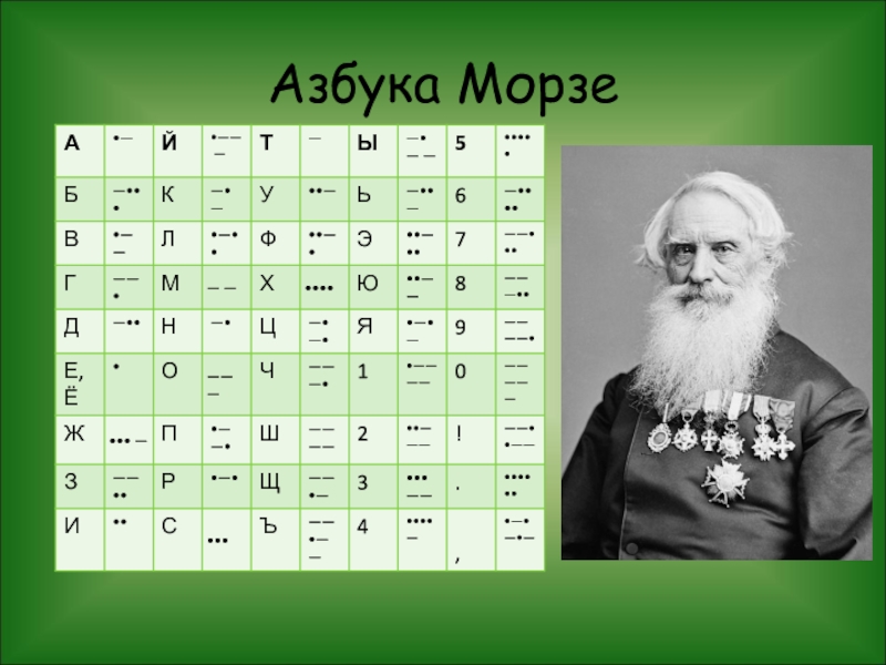 Код Мо́рзе, «Морзя́нка» (А́збукой Мо́рзе код начал называться только с начала первой мировой