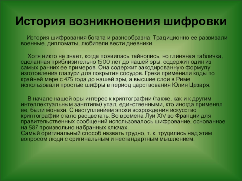 Хотя никто не знает, когда появилась тайнопись, но глиняная табличка, сделанная приблизительно 1500 лет до нашей эры, содержит один из самых ранних ее примеров. Она содержит закодированную формулу изготовления глазури для покрытия сосудов. Греки применили коды по крайней мере с 475 года до нашей эры, а высшие слои в Риме использовали простые шифры в период царствования Юлия Цезаря.