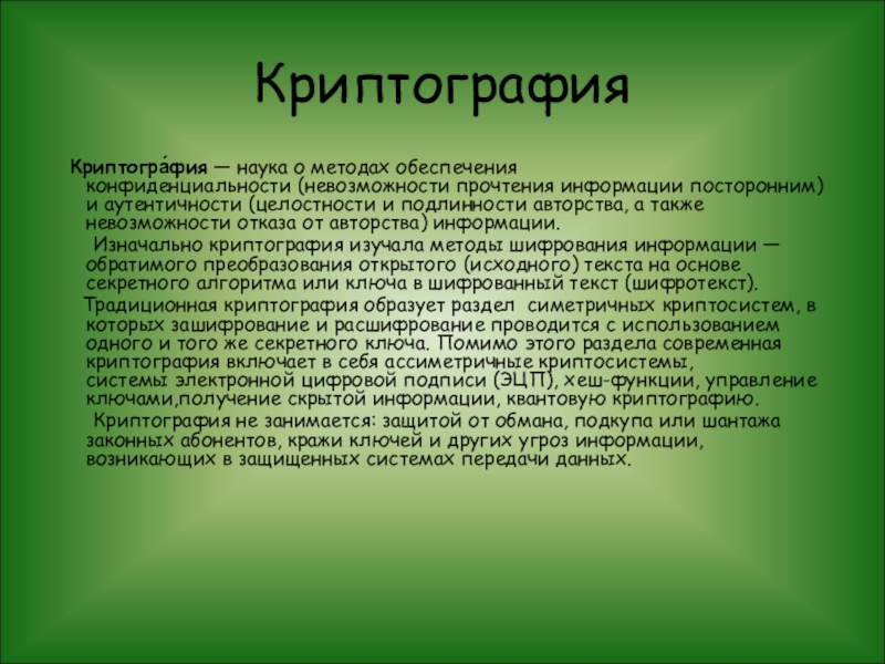 Криптография не занимается: защитой от обмана, подкупа или шантажа законных абонентов, кражи ключей и других угроз информации, возникающих в защищенных системах передачи данных.