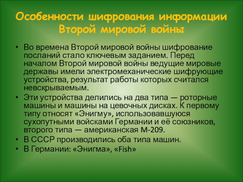 Слайд 9Особенности шифрования информации Второй мировой войны