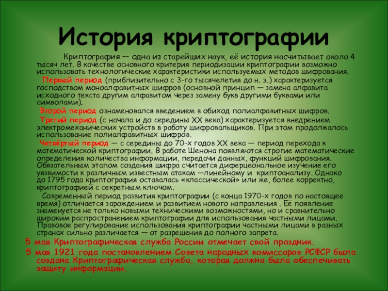 5 мая 1921 года постановлением Совета народных комиссаров РСФСР была создана Криптографическая служба, которая должна была обеспечивать защиту информации.