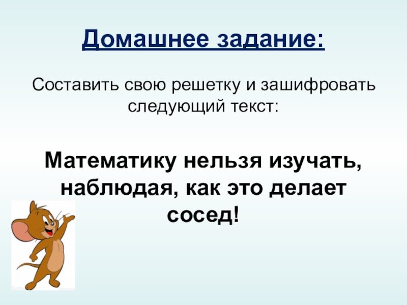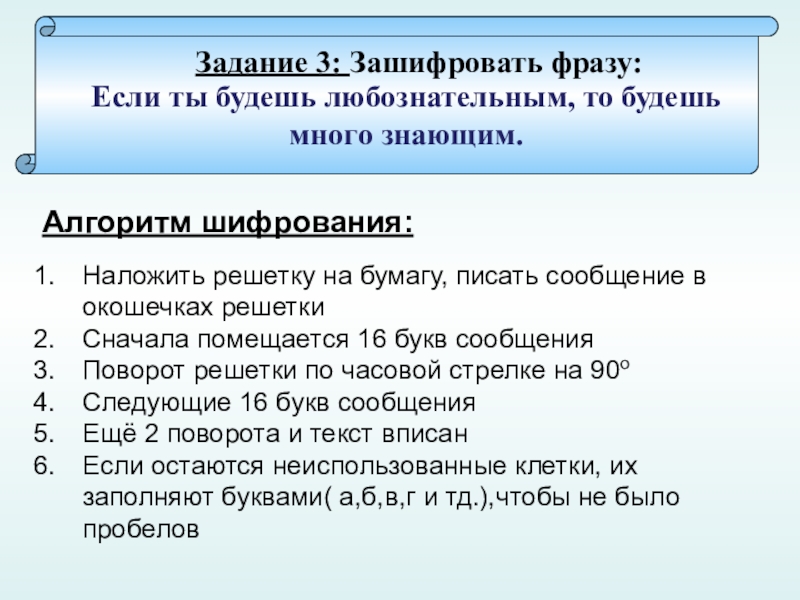 Наложить решетку на бумагу, писать сообщение в окошечках решетки