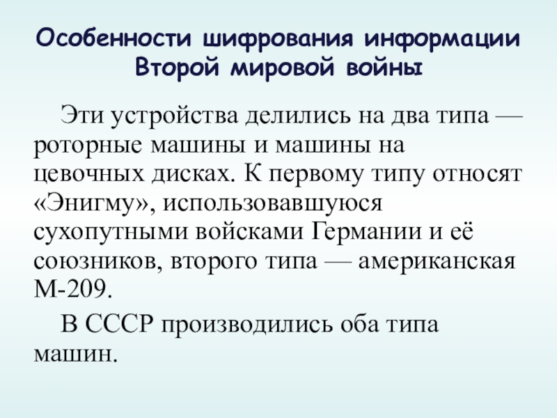 Энигма представляла собой как бы динамический шифр Цезаря. Т.е. изначально на барабаных выставлялось некое начальное значение (этакий random seed), которое и являлось ключом. Далее, при наборе букв, каждая буква шифровалась шифром цезаря, а потом, этот шифр менялся на другой.