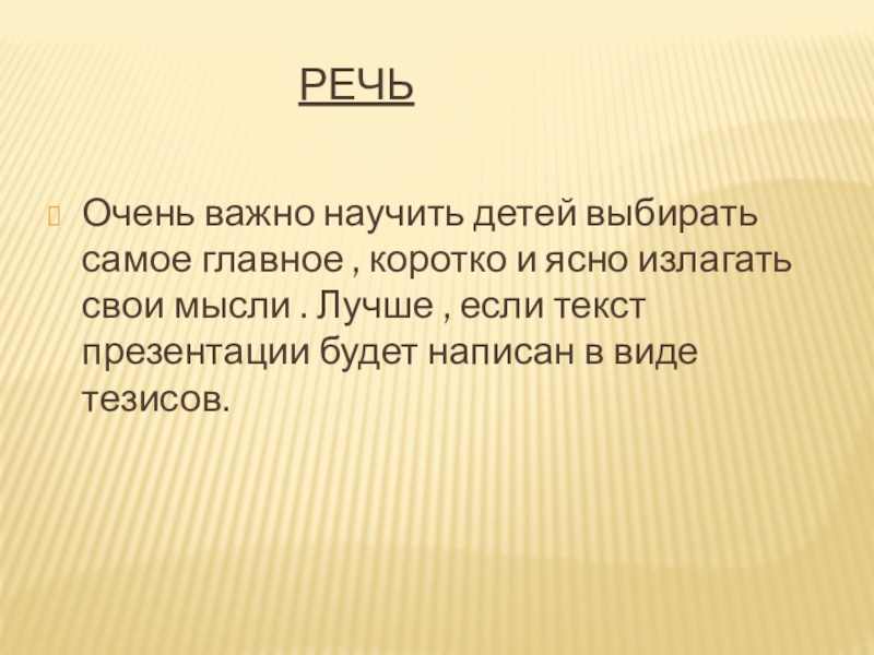 Очень важно научить детей выбирать самое главное , коротко и ясно излагать свои мысли . Лучше , если текст презентации будет написан в виде тезисов.