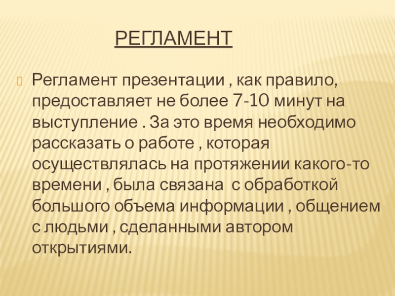 Регламент презентации , как правило, предоставляет не более 7-10 минут на выступление . За это время необходимо рассказать о работе , которая осуществлялась на протяжении какого-то времени , была связана с обработкой большого объема информации , общением с людьми , сделанными автором открытиями.