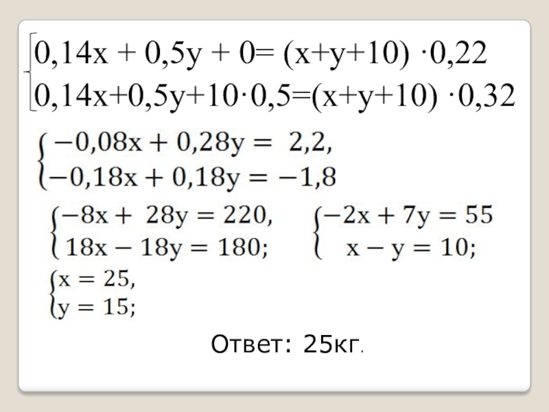 0,14х + 0,5у + 0= (х+у+10) ·0,22