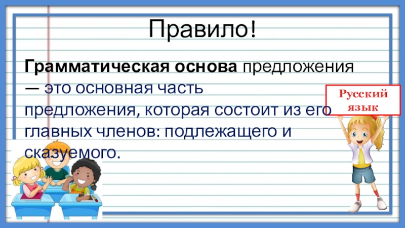 Правило!Грамматическая основа предложения — это основная часть предложения, которая состоит из его главных членов: подлежащего и сказуемого.
