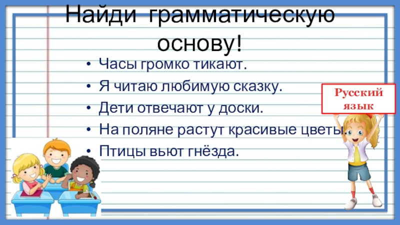 Найди грамматическую основу!Часы громко тикают.Я читаю любимую сказку.Дети отвечают у доски.На поляне растут красивые цветы.Птицы вьют гнёзда.