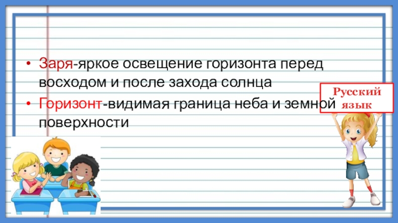 Заря-яркое освещение горизонта перед восходом и после захода солнцаГоризонт-видимая граница неба и земной поверхности
