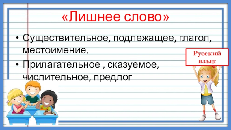 «Лишнее слово»Существительное, подлежащее, глагол, местоимение.Прилагательное , сказуемое, числительное, предлог