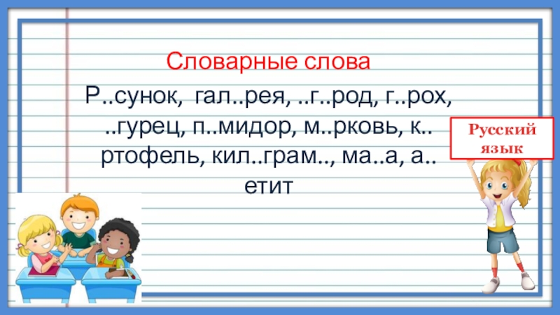 Словарные словаР..сунок, гал..рея, ..г..род, г..рох, ..гурец, п..мидор, м..рковь, к..ртофель, кил..грам.., ма..а, а..етит