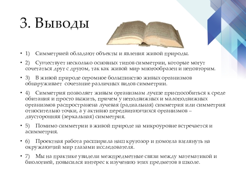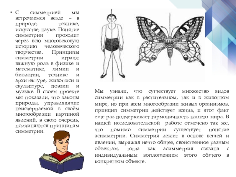 Мы узнали, что существует множество видов симметрии как в растительном, так и в животном мире, но при всем многообразии живых организмов, принцип симметрии действует всегда, и этот факт еще раз подчеркивает гармоничность нашего мира. В нашей исследовательской работе отмечено так же, что помимо симметрии существует понятие асимметрии. Симметрия лежит в основе вещей и явлений, выражая нечто общее, свойственное разным объектам, тогда как асимметрия связана с индивидуальным воплощением этого общего в конкретном объекте.