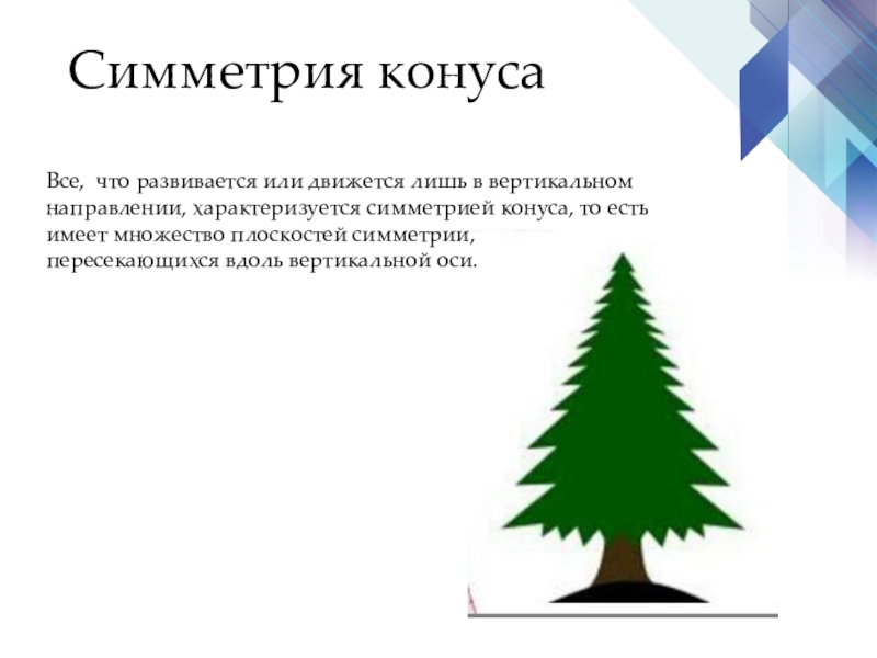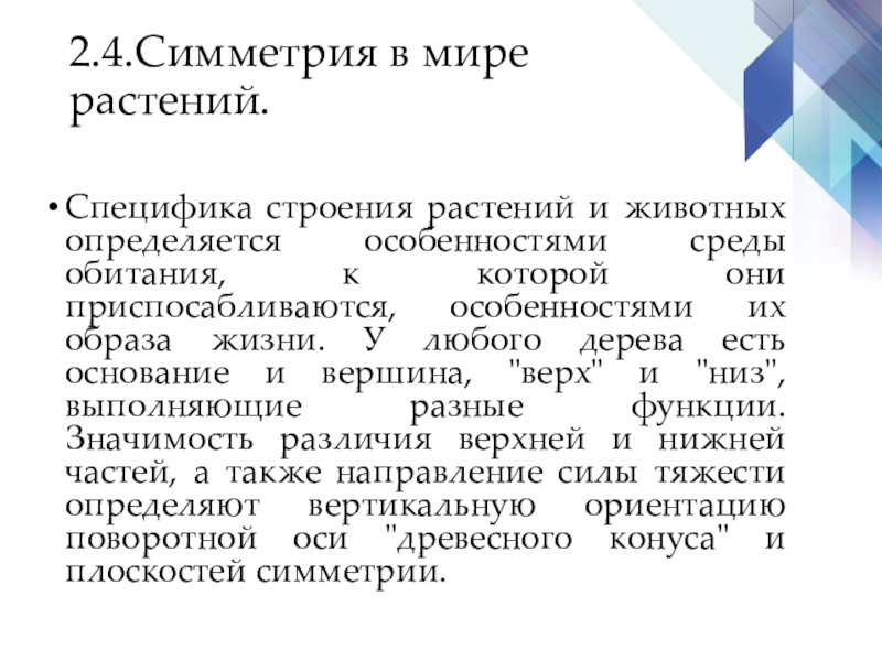 обитания, к которой они приспосабливаются, особенностями их образа жизни. У любого дерева есть основание и вершина, "верх" и "низ", выполняющие разные функции. Значимость различия верхней и нижней частей, а также направление силы тяжести определяют вертикальную ориентацию поворотной оси "древесного конуса" и плоскостей симметрии.