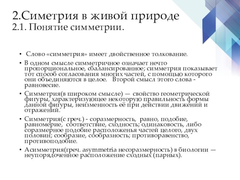 Симметрия(с греч.) - соразмерность, равно, подобие, равномерие, соответствие, сходность; одинаковость, либо соразмерное подобие расположенья частей целого, двух половин; сообразие, сообразность; противоравенство, противоподобие.