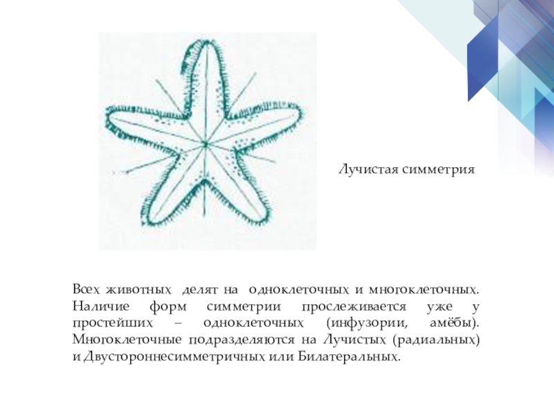 Слайд 17Всех животных делят на одноклеточных и многоклеточных. Наличие форм симметрии прослеживается