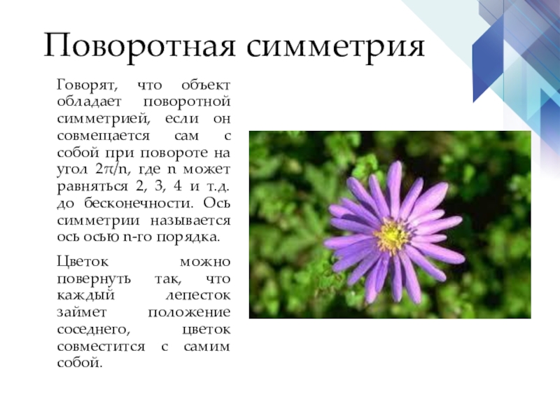 Цветок можно повернуть так, что каждый лепесток займет положение соседнего, цветок совместится с самим собой.