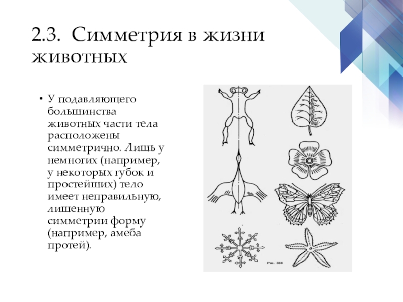 симметрично. Лишь у немногих (например, у некоторых губок и простейших) тело имеет неправильную, лишенную симметрии форму (например, амеба протей).